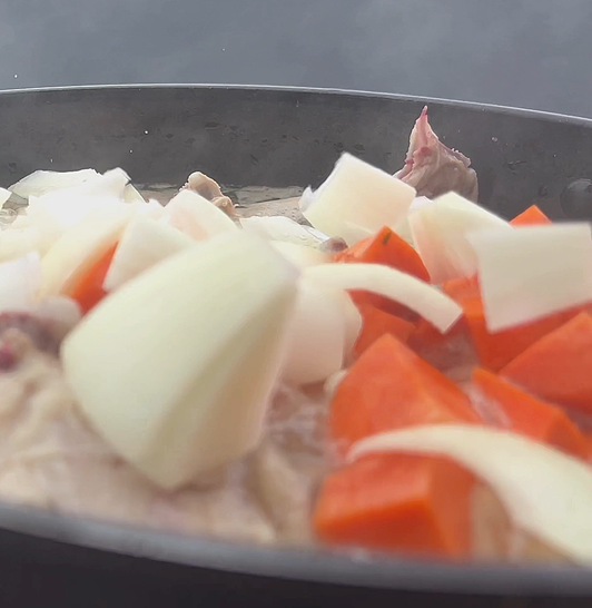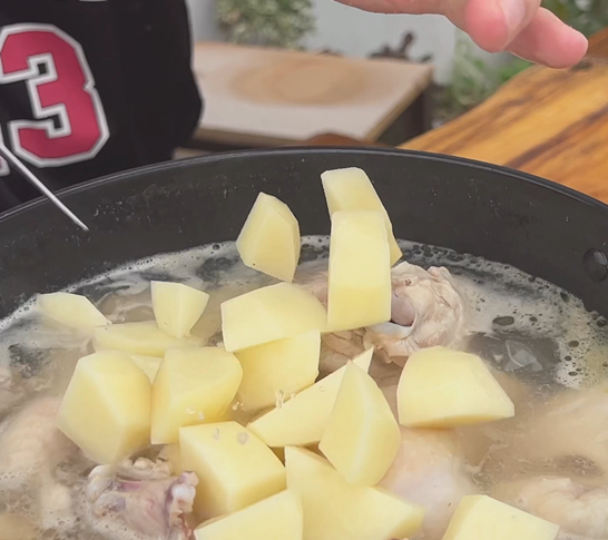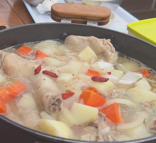 다음은 끓고 있는 닭과 육수에 야채를