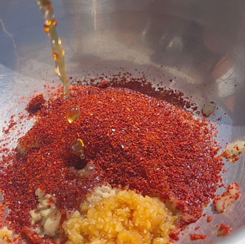 Gochugaru 6T, Aekjeot (Korean fush sauce) 3T, Minced garlic 1T, Minced ginger 0.5, plum syrup 2T, Suger 1T,