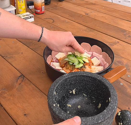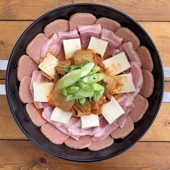 통조림햄, 돼지고기, 두부, 김치와 같은 주재료가 다 올라갔으면 다음으로 부재료인