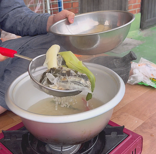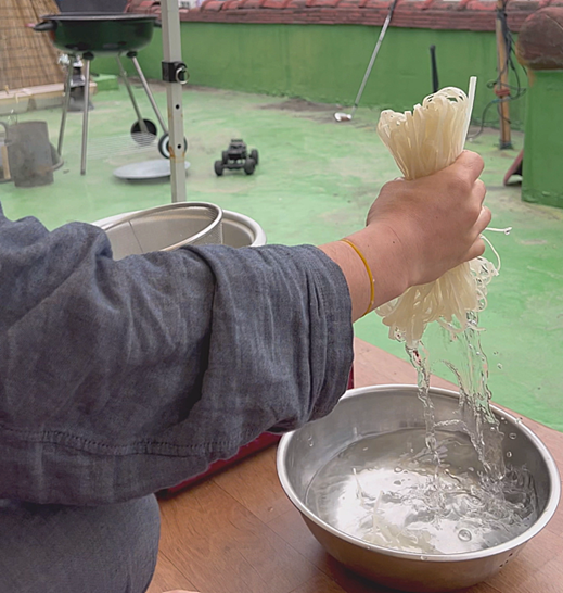 저처럼 깊은 냄비에 삶으심 체를 안에 넣어놓고 육수에 불린 쌀국수면을 삶으시면 편하고