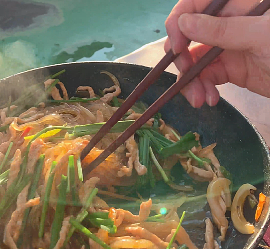 너무 뜨거운 물에 당면을 불리면 익어버릴 수 있으니 미온수 혹은 찬물에 불리시면 돼요.