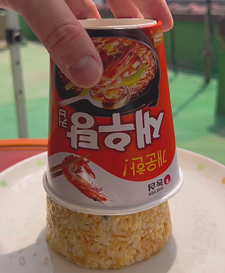 잘 만드신 컵라면 볶음밥을 컵라면에 꾹꾹 눌러 담아주세요.